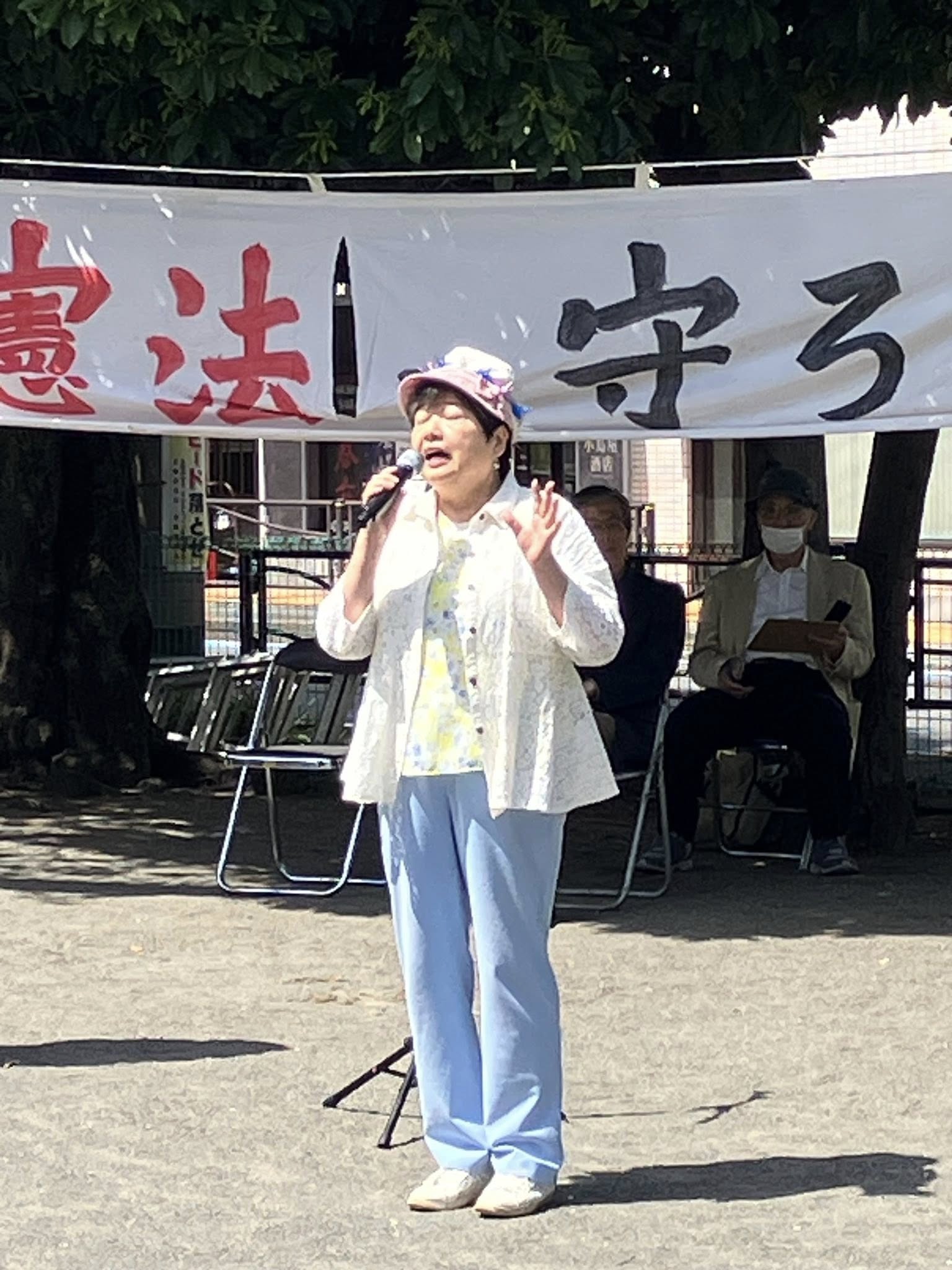 集会では、歌あり訴えあり、多彩な人たちが憲法守れ、戦争するなと声を上げました。市会議員も招待され、立憲の島田議員と私が連帯の挨拶。私は「戦争の足音がする重大な情勢だけど、戦前と違うのは、この憲法があり、こんな集会をやっても捕まえに来ない。声を上げられる。国じゅうの隅々から声を上げて、平和と暮らしを守ろう、と訴えました。