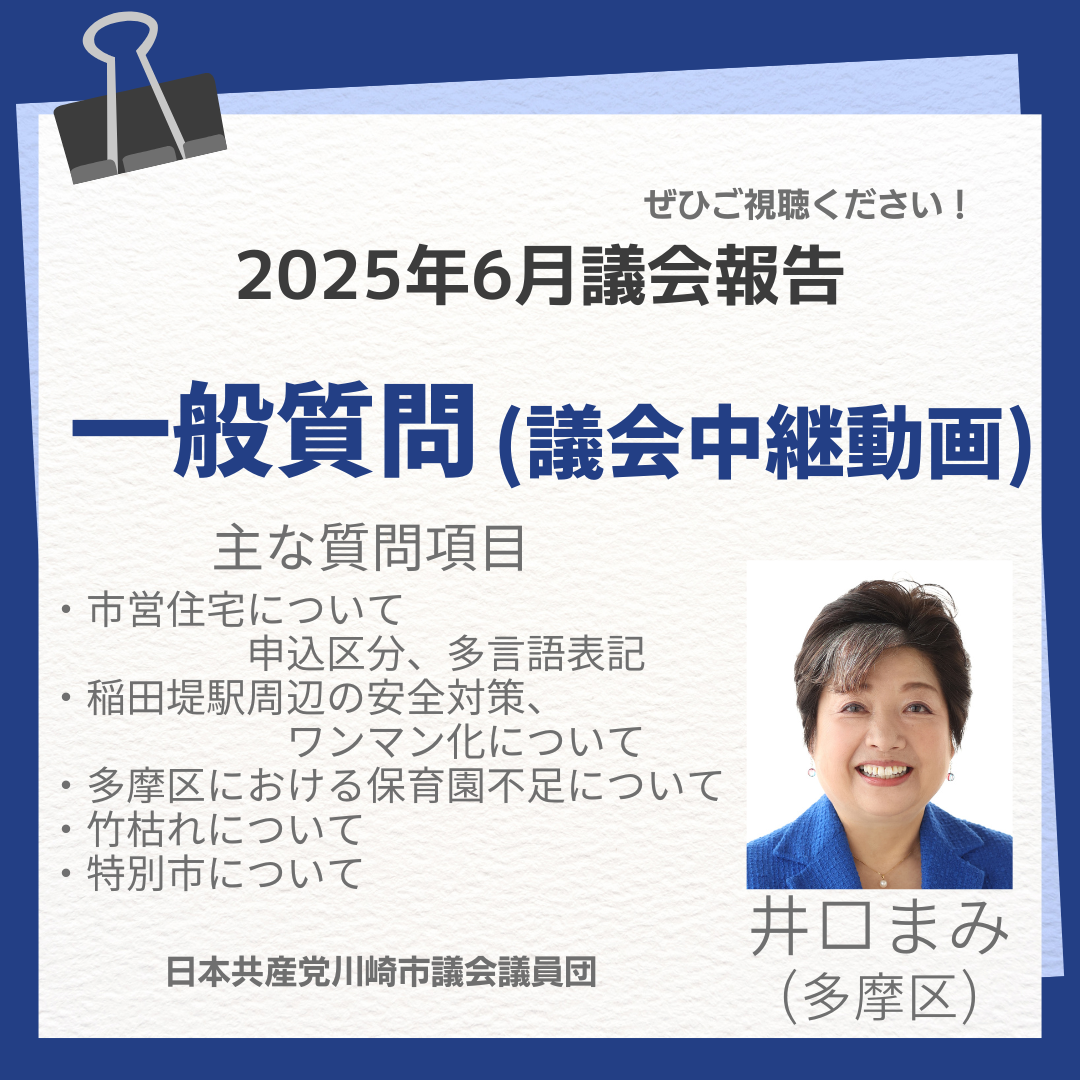 2025年6月24日の川崎市議会定例会で、井口真美議員が一般質問を行いました。主な内容は以下の通りです。