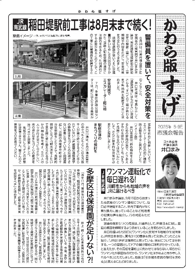 6月議会の活動を報道した議会報告「かわら版すげ」2025年8・9月号を発行しました。1面トップは稲田堤駅前空間の整備についてですが、工事はそれなりにどんどん進んでいて、この絵はサクが完成する前のイメージ図ですが、印刷している間にサクができてしまいました。まだ夏休みで、学生さんがいないだけ人が少ないのですが、9月に入ってどうなるか、とても心配しています。2面の樹冠被覆率は新しい提案です。皆さんのご意見をお寄せください。