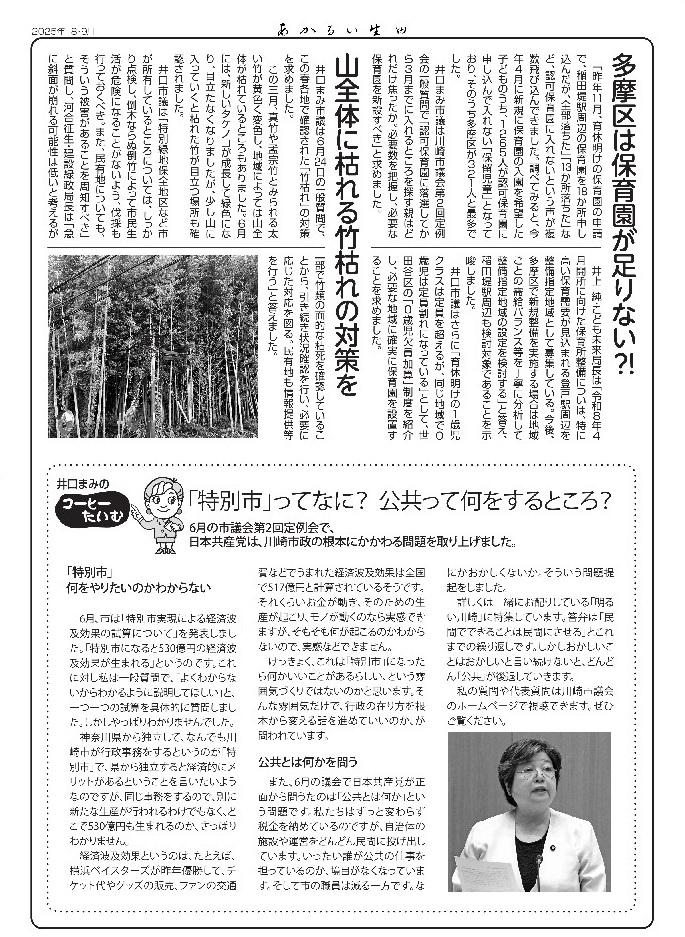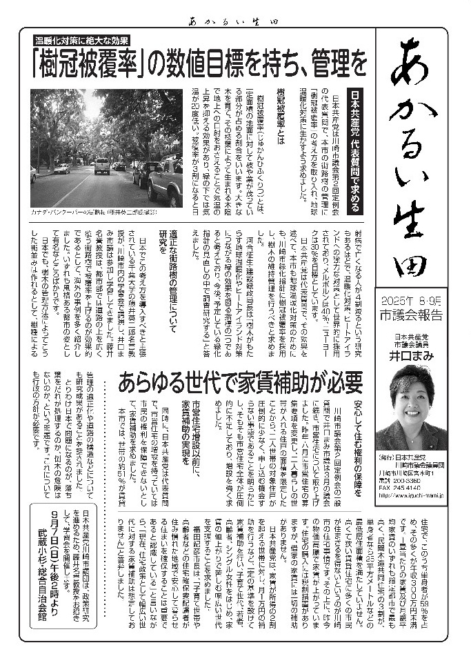 6月議会を報道した「明るい生田」2025年8・9月号を発行しました。樹冠被覆率という新しい考え方を議会で提案しました。地球温暖化に真剣に取り組む市であってほしいと思います。2面では市がいまやたらお金をかけている「特別市」について、さらには公共とは何かという問題を取り上げました。