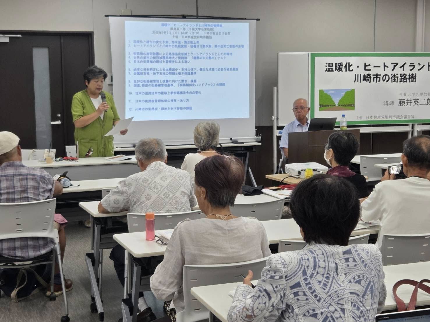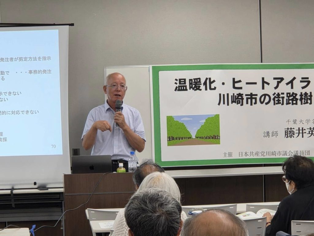 9月7日、近ごろめいっぱい関心を持っている「樹冠被覆率」について、日本共産党川崎市議団で学習会を開催しました。講師は、6月にお話しを伺って、目からうろこが何枚も落ちた、千葉大学名誉教授の藤井英二郎先生。私は司会を務めました。きょうも90分、しっかりと学び、川崎市に何を求めれば良いか、わかってきました。市民の皆さんも関心が高く、オンラインも含めて70人が参加しました。