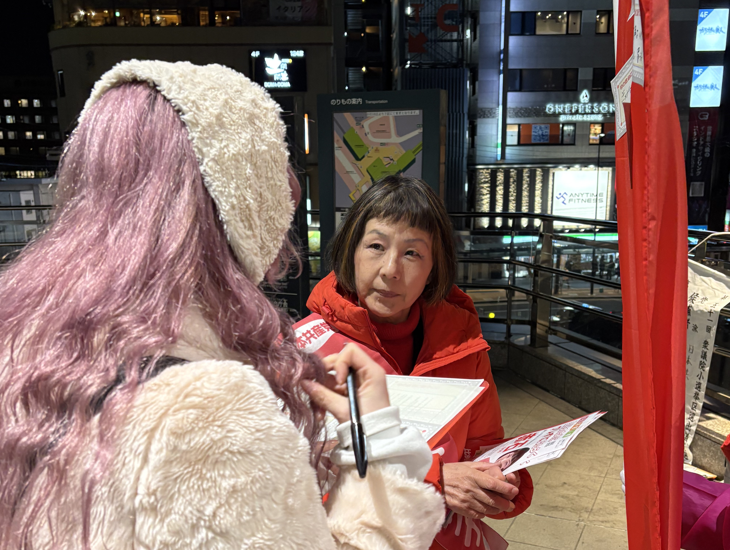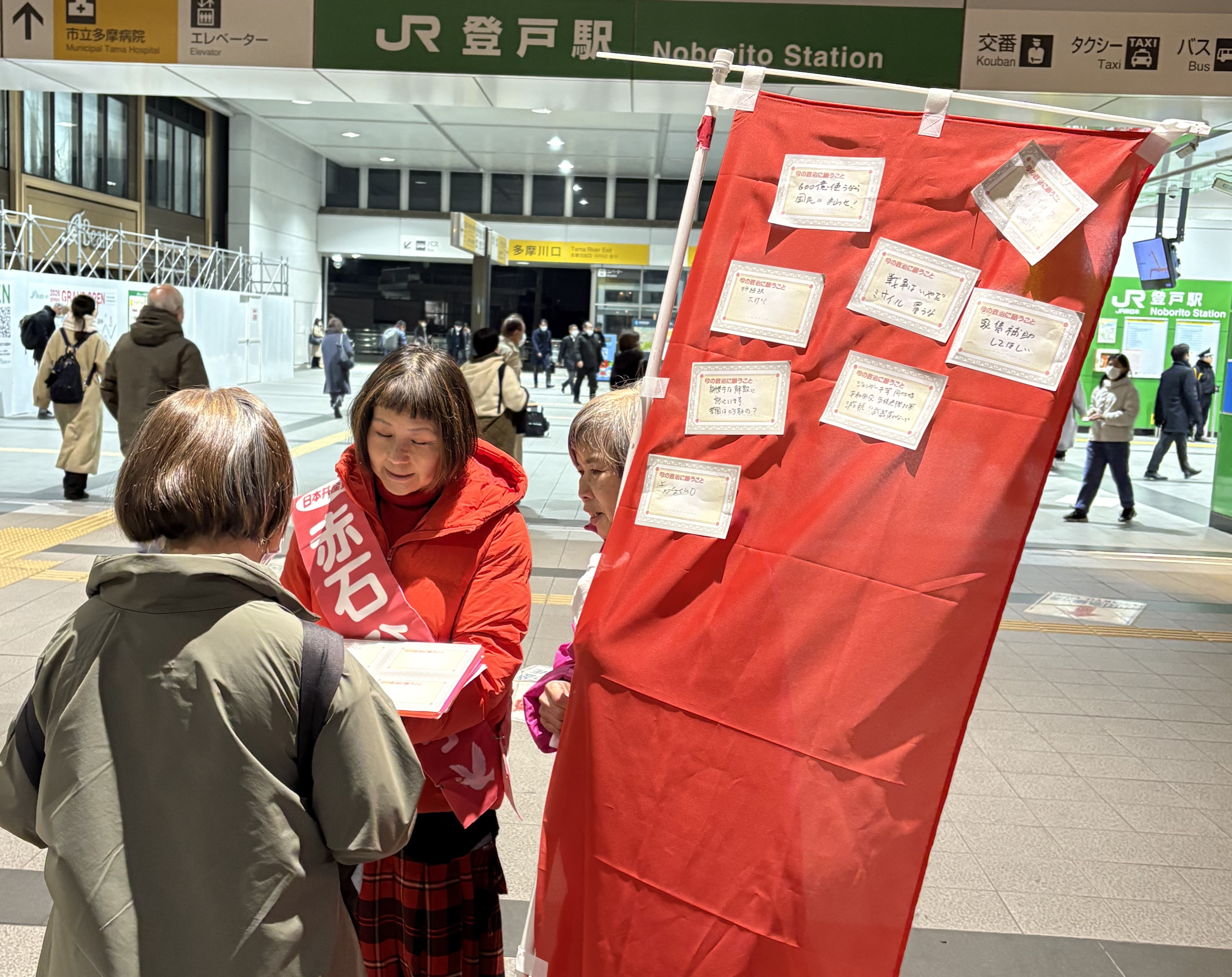 でも高市さんは解散しました。ならばこんな理不尽な政治そのものを変えるチャンスにしたいと、公示日から勇躍まちにうってでました。赤石ひろ子小選挙区候補とともに、街頭から訴えました。公示当日の夜、登戸駅では「あなたが政治に願うことを書いて、この赤いのぼりに貼ってください」とペンを差し出すと、足を止めて話し合いになる人が。ビラを配っていても「がんばれよ」「もう『中道』ではだめだ」と声をかけてくれる人もたくさんいます。